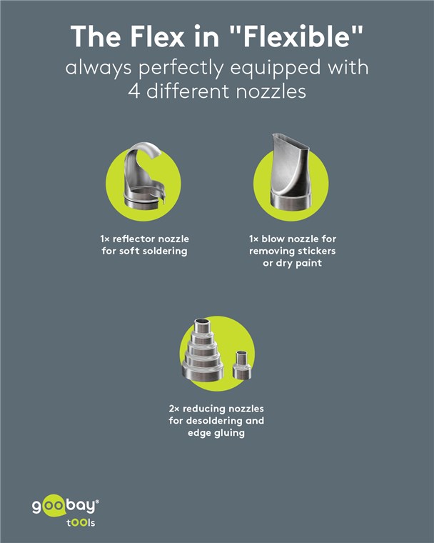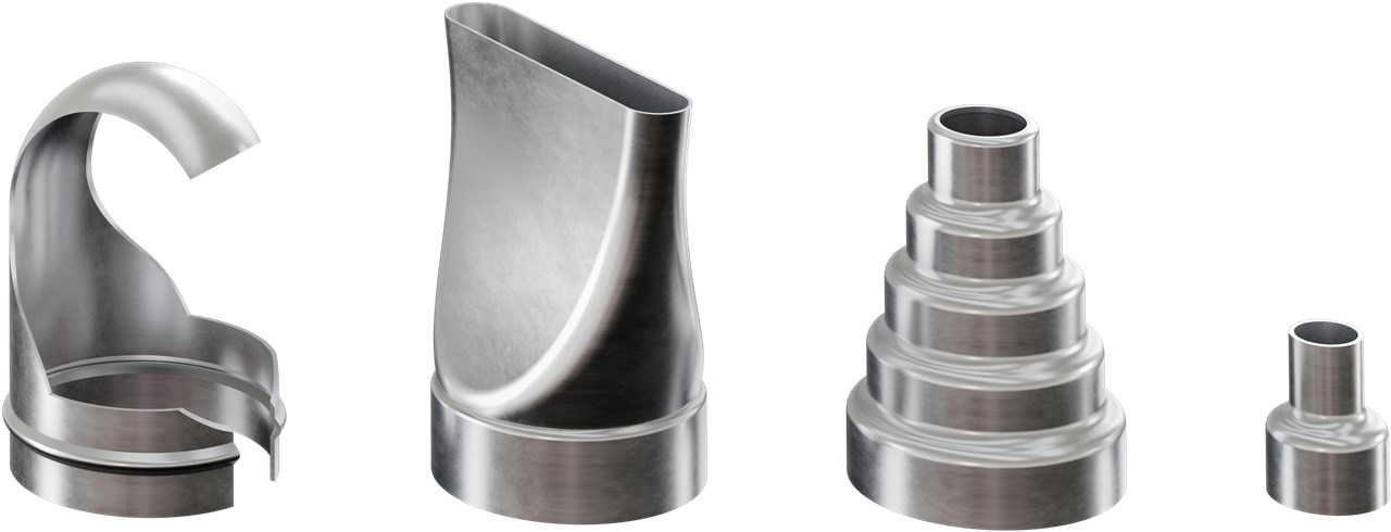 - W zestawie cztery dysze: 1x płaska dysza strumieniowa do usuwania naklejek lub zaschniętej farby, 1x łopatkowa dysza refleksyjna do miękkiego lutowania, 2x wąskie dysze redukcyjne do lutowania lub klejenia krawędzi