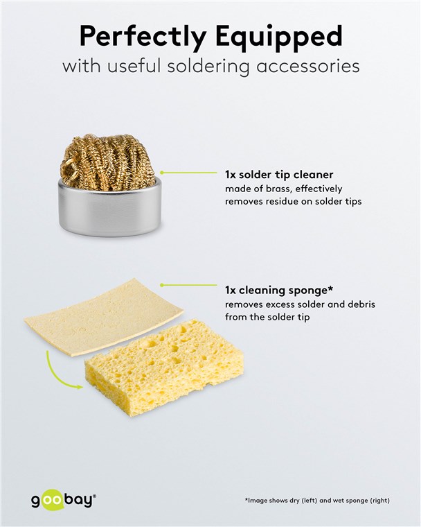 • W zestawie wełna czyszcząca i gąbka lutownicza do szybkiego czyszczenia grotu lutowniczego podczas pracy