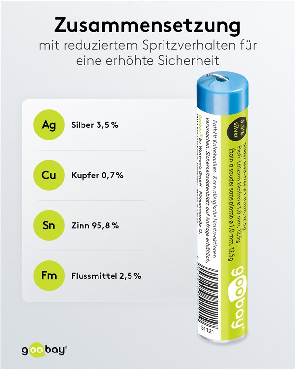 • Wysokie proporcje srebra i miedzi (Sn3.5Ag0.7Cu) zapewniają optymalną płynność i lepszą jakość powierzchni w lutowaniu bezołowiowym