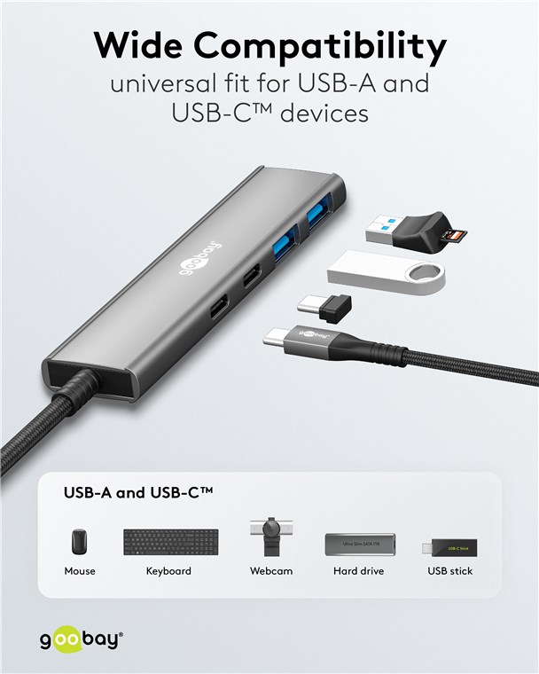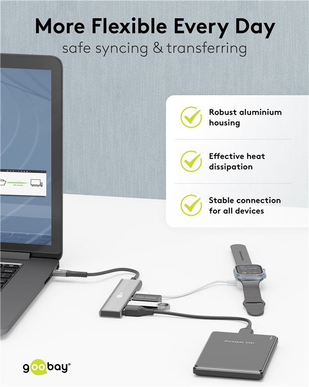 Maksymalna łączność dla każdego tabletu, smartfona lub laptopa za pośrednictwem tylko jednego portu USB-C™: Smukły hub zwielokrotnia połączenie, aby pasowało do wszystkich urządzeń USB-A i USB-C™, a jednocześnie zapewnia superszybkie prędkości transmisji danych 5 Gbit/s. Koniec z irytującym ponownym podłączaniem lub zbyt małą liczbą portów – praktyczny adapter wieloportowy jest idealnie przygotowany na wszystkie cyfrowe wyzwania.