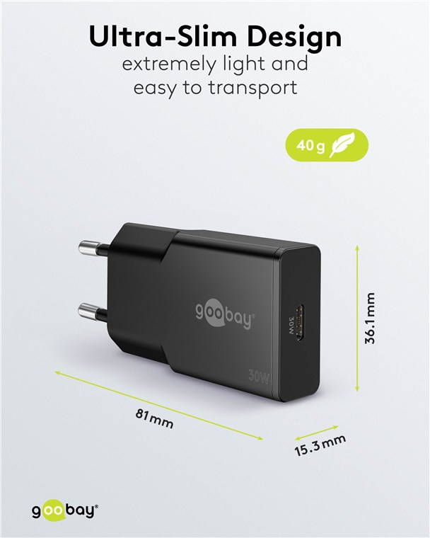 - Moc 30 W sprawia, że adapter do ładowania jest specjalnie dostosowany do małych urządzeń, takich jak smartfony, słuchawki Bluetooth, tablety czy powerbanki