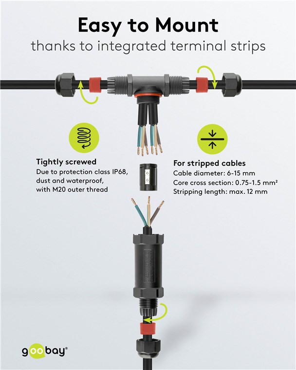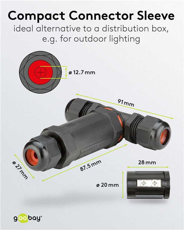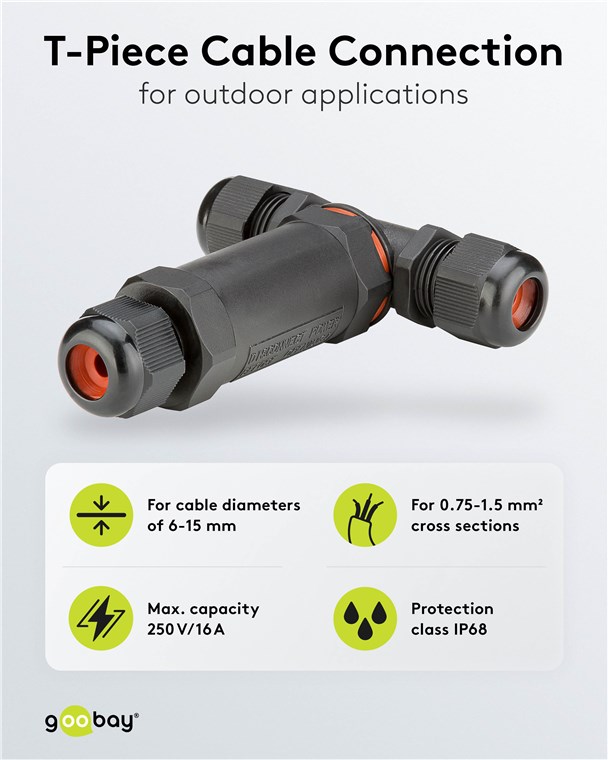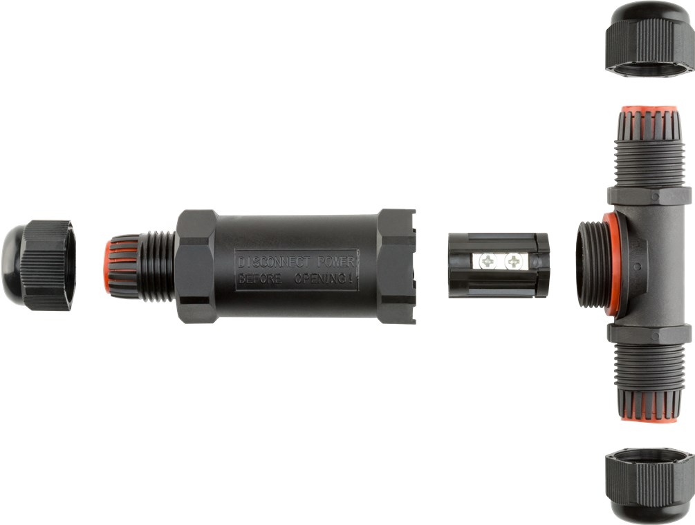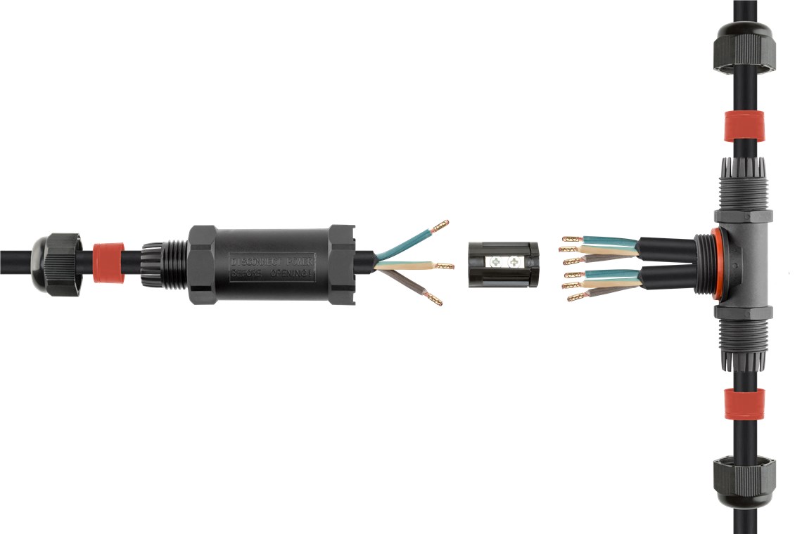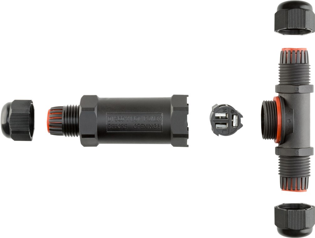 - Złącze w kształcie litery T jest idealny do zewnętrznego okablowania oświetlenia zewnętrznego.