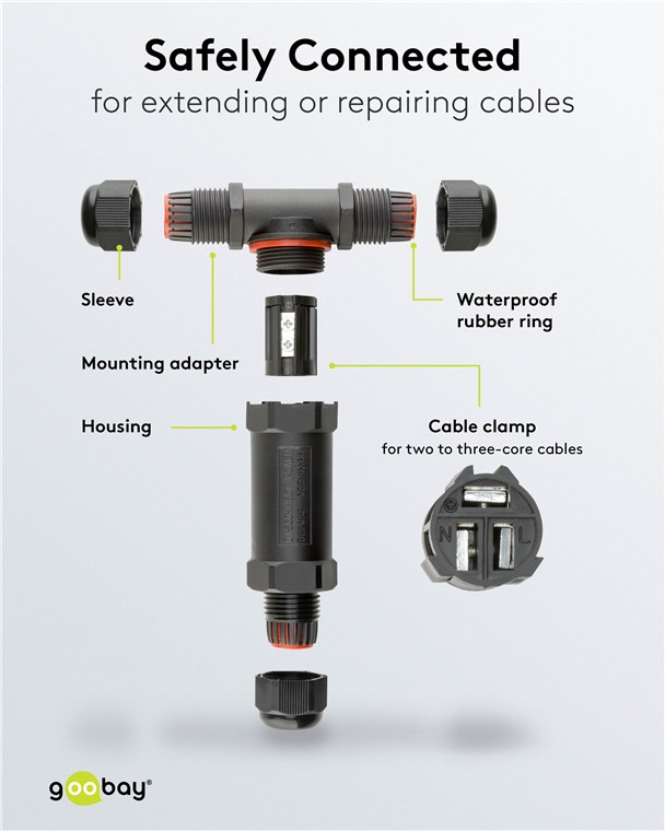 - Puszka kablowa oferuje bezpieczne, proste rozwiązanie do łączenia, przedłużania lub naprawy dwu- i trzyżyłowych kabli zasilających