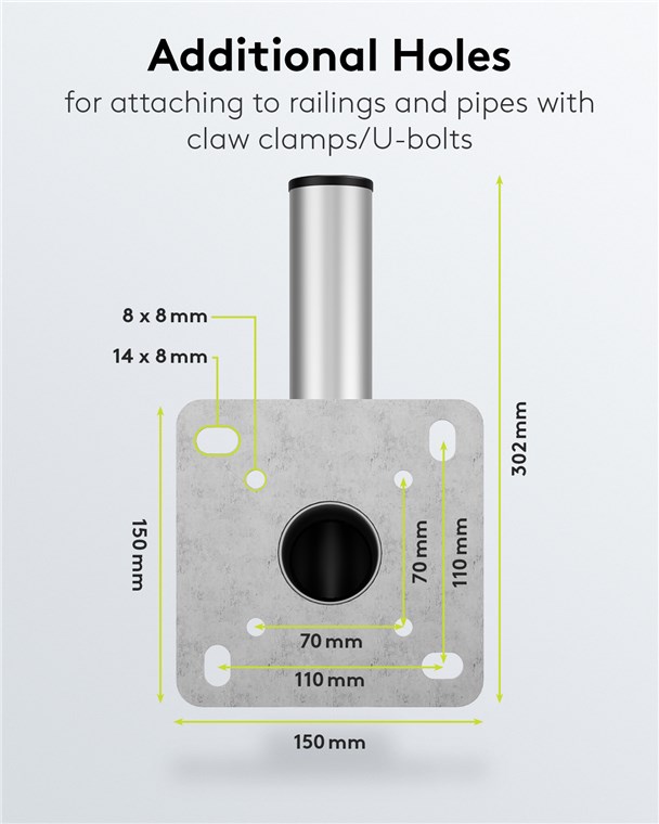• Dodatkowe otwory do mocowania uchwytów do rur typu U do poręczy balkonu lub do rur pionowych, rozstaw otworów: 70 mm