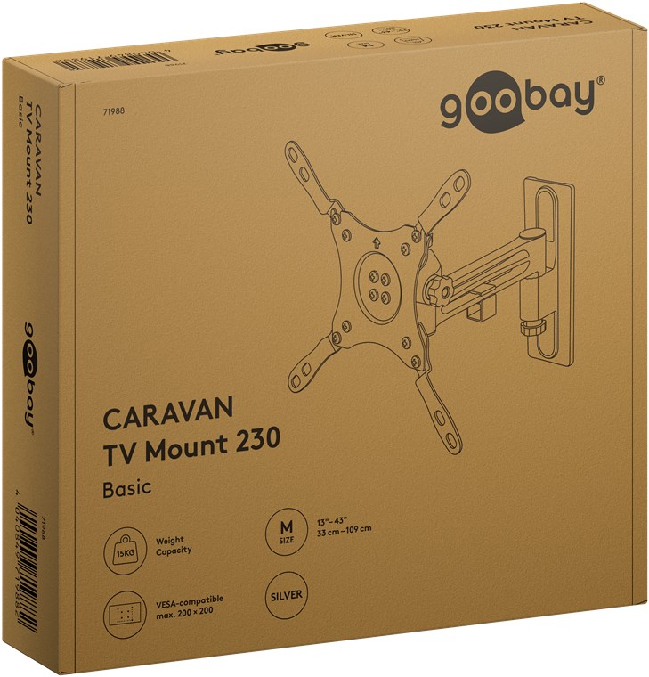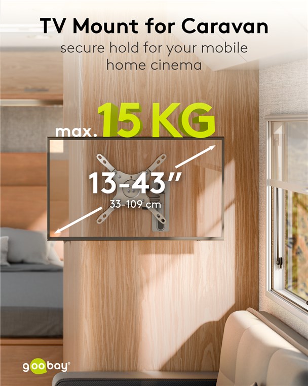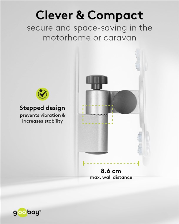 Praktyczny uchwyt ścienny przekształca samochód kempingowy w mobilne kino domowe: Telewizja, filmy i transmisje strumieniowe na ekranie o przekątnej do 43 cali zapewniają teraz rozrywkę w drodze i na wakacjach. W celu bezpiecznego transportu, uchwyt jest po prostu blokowany na miejscu za pomocą śruby blokującej – dla niezawodnego trzymania i bez irytujących wibracji podczas podróży.