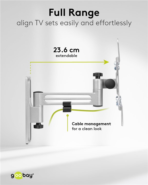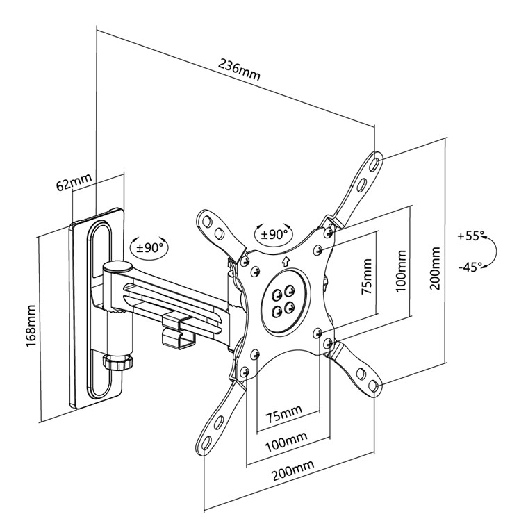 - Idealny do stabilnego montażu na ścianie średniej wielkości telewizora o wadze do 15 kg, może być przechylany o +55/-45° w celu uzyskania idealnego kąta widzenia i obracany o ±90° na każdym przegubie