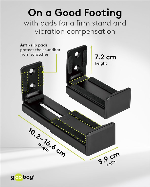 - Regulowany uchwyt do większości popularnych soundbarów o głębokości 90-154 mm, np. firm Samsung, LG, Sonos, Sennheiser, Teufel lub JBL