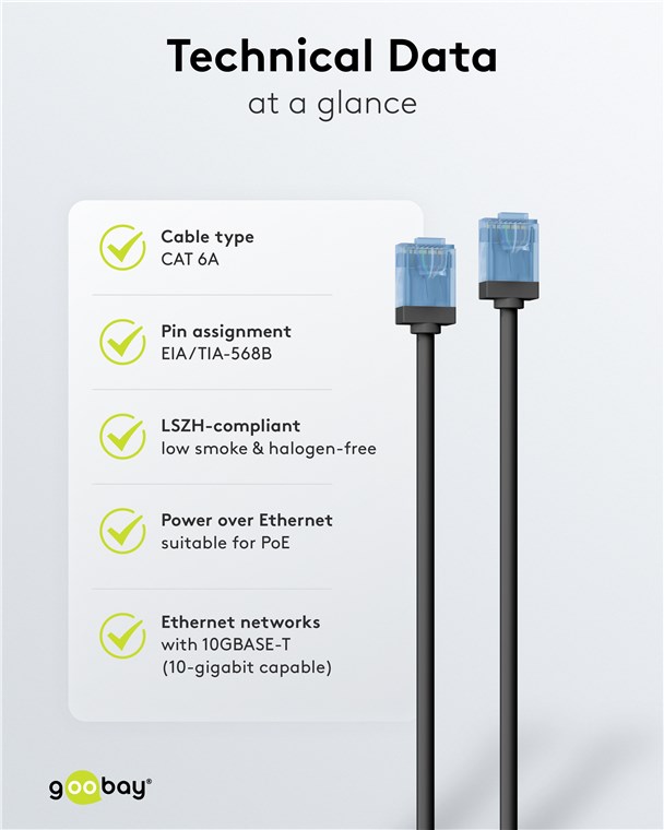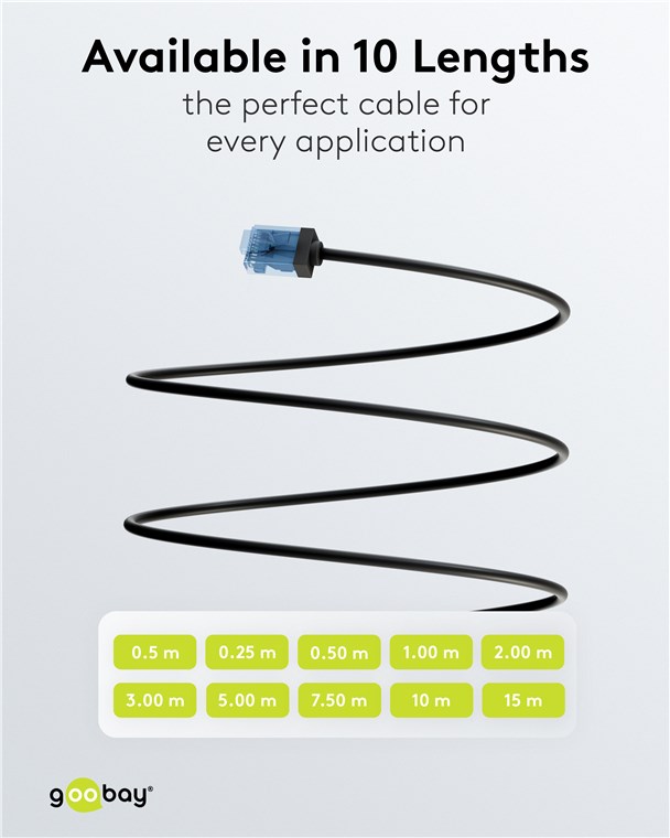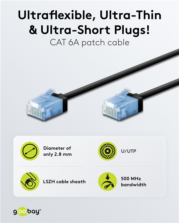 - Supercienki kabel LAN z bardzo krótkimi złączami RJ45 zapewnia (15,3 mm) mniejszą objętość kabla w szafie serwerowej lub panelu krosowym, a tym samym optymalną cyrkulację powietrza