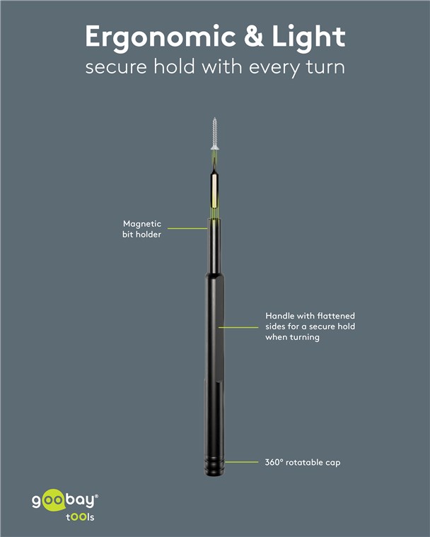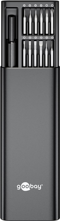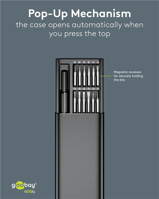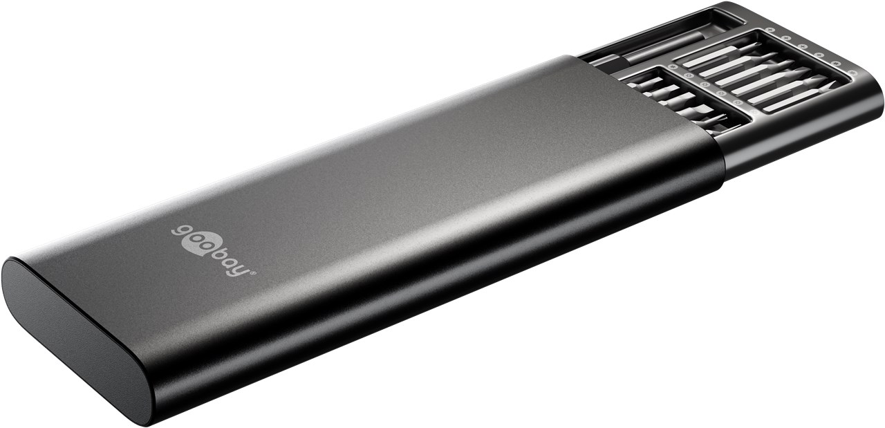Jakość, którą można poczuć: Zestaw śrubokrętów przekonuje matową obudową z aluminium i dopasowanym kolorystycznie uchwytem na bity. Szczególna cecha: futerał otwiera się za pomocą mechanizmu wysuwanego. W przeciwieństwie do tradycyjnych pudełek z klapką, tutaj nie ma ryzyka złamania zamknięcia, a futerał pozostaje bezpiecznie zamknięty podczas transportu lub przechowywania w skrzynce narzędziowej.