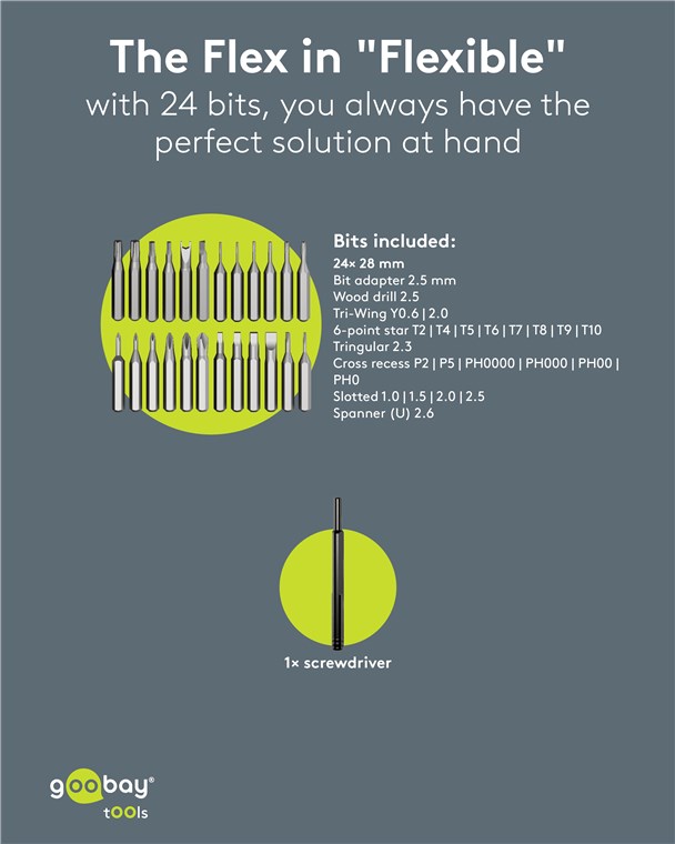 • 1x adapter 2,5 mm, 8x sześciokątny (T, TH), 1x trójkątny (2,3), 6x krzyżakowy (PH, P), 4x płaski, 1x kluczyk (2,6), 2x trójramienny (0,6, 2,0), 1x wiertło do drewna (2,5)